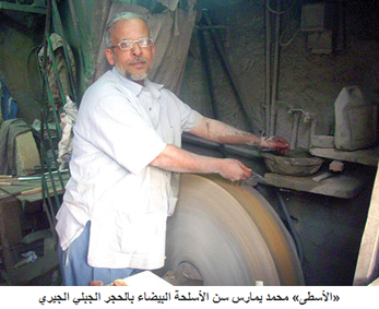 ثم يكمل شرحه قائلا «سن الأسلحة البيضاء بالحجر الجبلي الجيري هو أصل عملية مهنة السن، التي يعود تاريخها إلى العصر الفرعوني، وصولا إلى الدولة الإسلامية في عهد الرسول (صلى الله عليه وسلم)، ومن ثم شهدت المهنة ازدهارا في مصر إبان عهد الدولة الفاطمية، وبالتحديد في منطقتي الحسين والسيدة زينب.. حيث كانت السيوف وغيرها من الأسلحة البيضاء تسن - أو تصقل - على الحجر مع سكب المياه على السلاح لإزالة (الرايش) المترسب على السلاح نتيجة السن. ويتميز السن على الحجر عن السن بماكينات الجلخ الكهربائية بأن الحجر يجعل السكين حادة و(روحها حلوة) وتقطع من دون انحراف يمينا أو يسارا من دون حدوث اعوجاج لها».